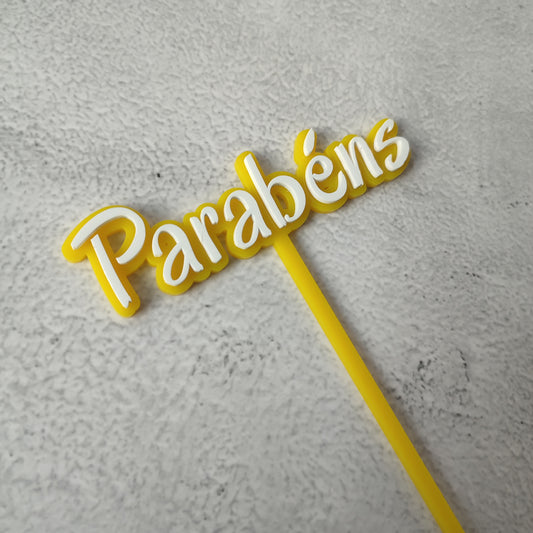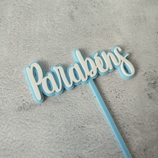 Este topper tem um design moderno e contemporâneo, feito em acrílico espelhado de alta qualidade, proporcionando um acabamento brilhante e reflexivo. Ele possui a palavra "Parabéns" recortada de forma precisa, criando um efeito estético único.