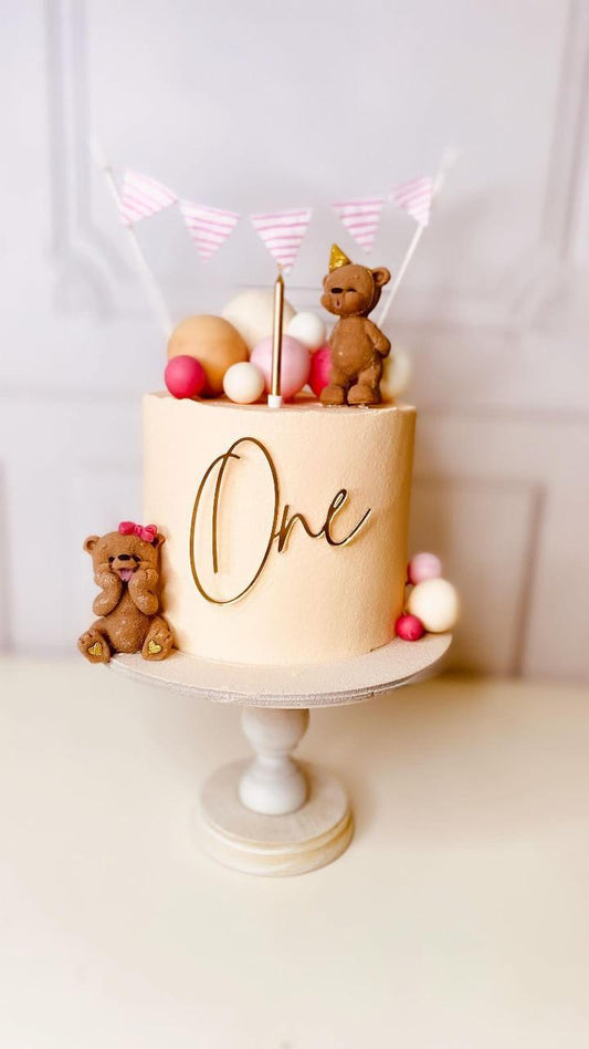Toppers com a palavra "One" e outros modelos em acrílico. Para comemorar o primeiro ano com um bolo mais sofisticado de sempre!