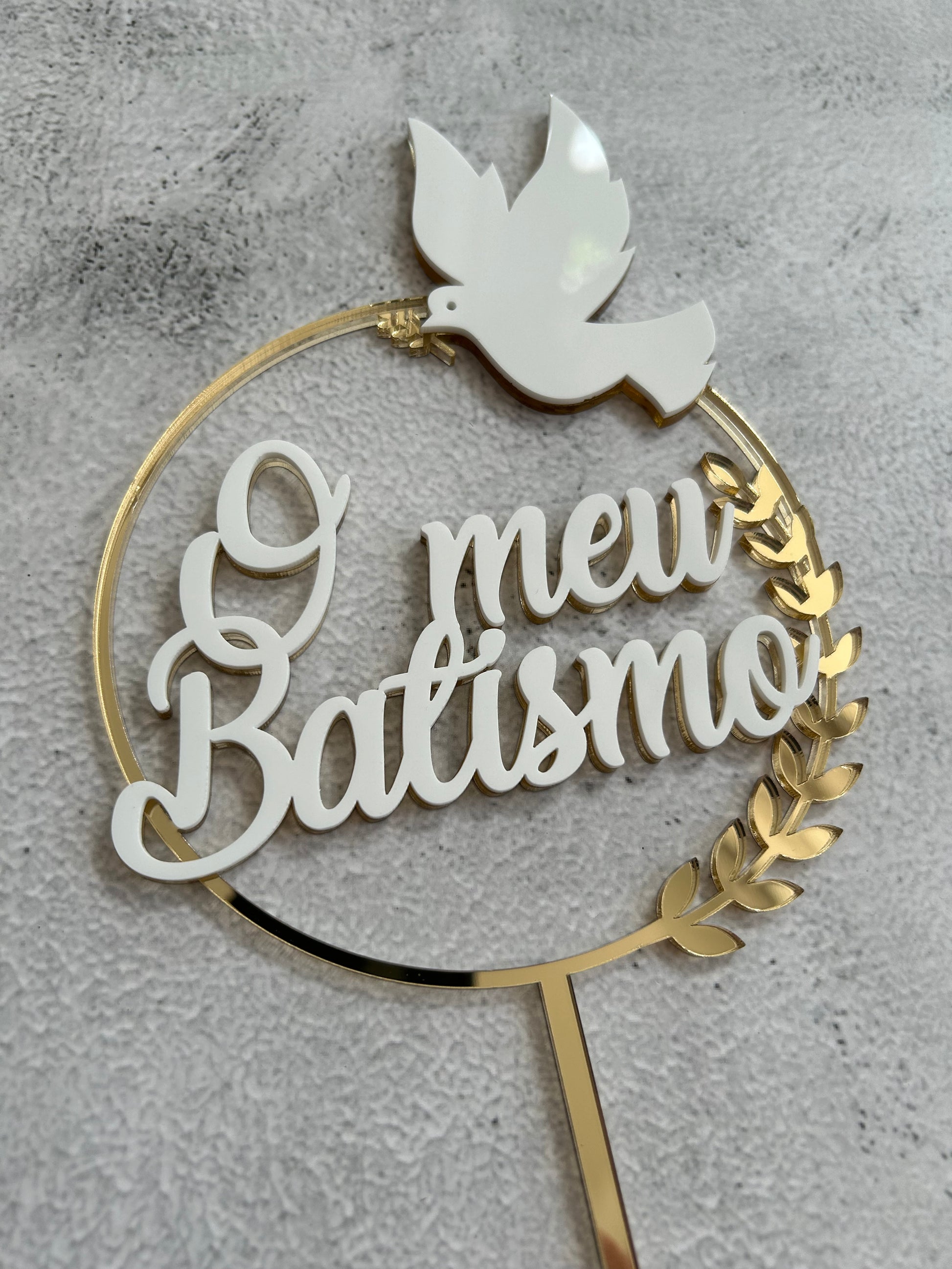 Topper de bolo "O Nosso Batizado" em acrílico duplo espelhado dourado e branco (também disponivel em acrílico Prateado, Rose Gold).